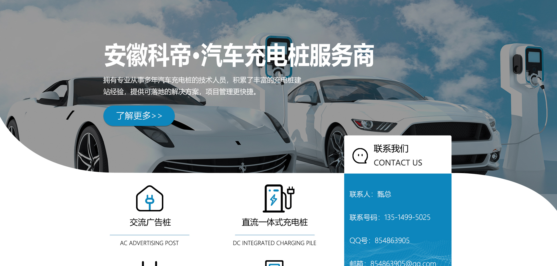 关于我们安徽科帝新能源科技有限公司坐落于安徽省会-合肥,是一家研发、生产智能充电桩设备,汽车充电站后台监控管理系统和生产高压开关设备的企业.由专门的研发团队、管理团队按照现代化企业制度规范设立的有限责任公司。致力于为能源智能、安全的应用和节能减排提供整体的技术与产品解决方案。科帝集研发、设计、生产、销售以及服务于一体,在电动汽车充电方案,充电设施建设和城市配电方面拥有广泛的技术研究及经验积累,为客户提供安全、智能的充电设备及充电运营站建设一体化解决方案。并坚持以人为本、质量为先、顾客至上、不断创新”的企业理念,为能源行业的发展、节能减排做出重大的贡献。公司拥有丰富的产品种类,目前科帝已研发生产了三十多种产品,充电设备有直流一体式充电桩、直流分体式充电桩、直流广告桩、交流广告桩、广告一体桩、壁挂交直流桩;等多种充电设备;每一款产品都是精心打造,力求为客户提供优越的用户体验。展望未来科帝将通过持续的自...